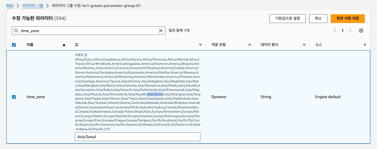 다음으로 생성한 파라미터 그룹으로 들어가서 time_zone 파라미터의 값을 Asia/Seoul 로 수정.