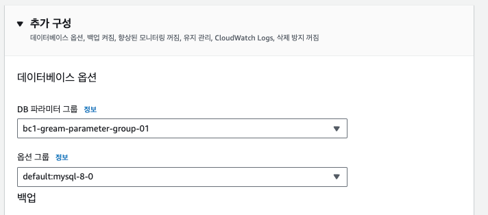 그 다음으로, DB 인스턴스로 들어가서 편집 -> 추가 구성 -> 데이터베이스 옵션 중 DB 파라미터 그룹을 위의 파라미터 그룹으로 변경