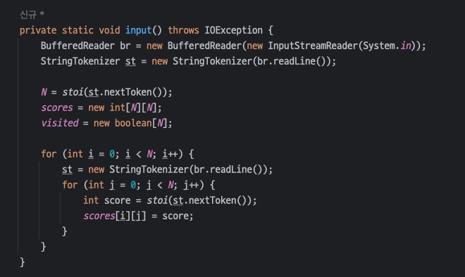 이번에 풀 때는 입력을 받는 부분을 따로 빼서 input 메서드로 처리를 해봤다.