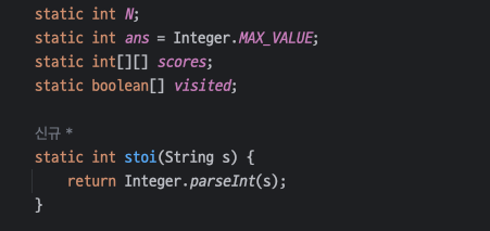 우선 내 습관대로, 문제에서 쓰이는 전역 변수는 따로 static 으로 가장 상단부에 선언을 해둔다. 그리고 String to int 메서드도 만들어서 쓰는 편.