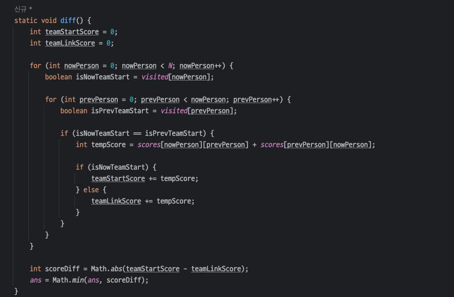 visited 가 true인 사람을 스타트팀으로, false를 링크팀으로 정해서 전체 팀원 수의 절반 (N / 2) 가 되면 팀편성이 완료되어 종료조건으로 정했다.