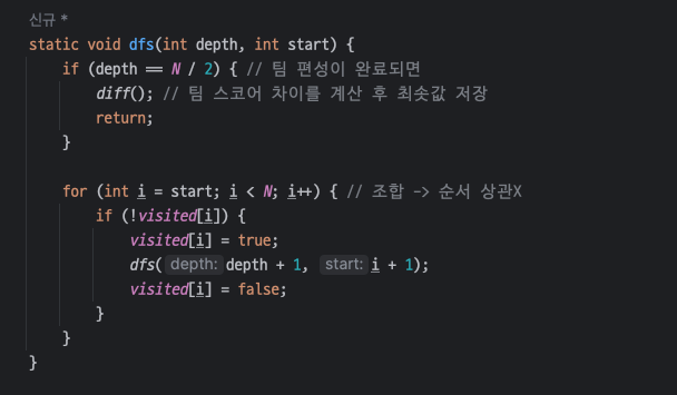 if (depth == N / 2) { // 팀 편성이 완료되면