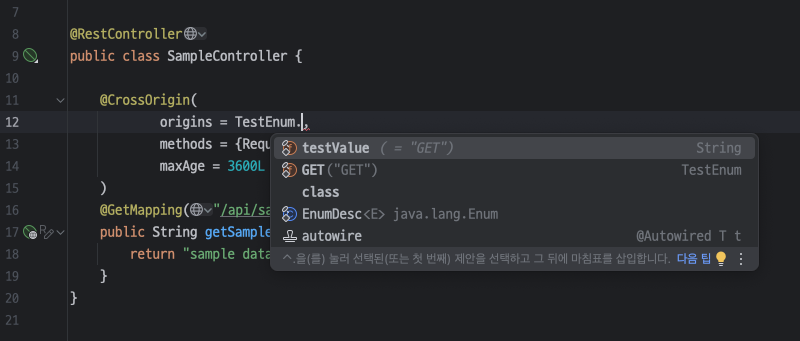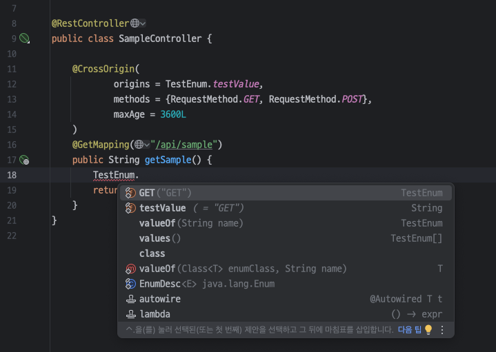 ENUM으로도 테스트 해봤는데 어노테이션 속성으로는 static 속성들만 표시가 되었다. (TestEnum.GET도 내부적으로는 public static final TestEnum GET = new TestEnum("GET") 이니깐.)