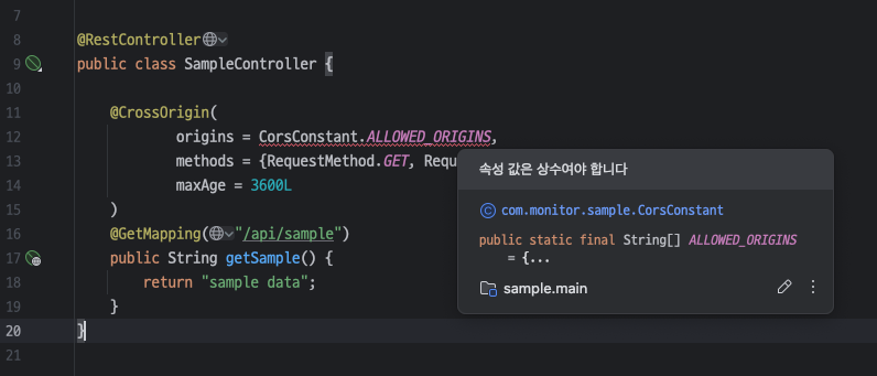 @CrossOrigin 어노테이션에 origins를 입력 중, 상수 클래스를 만들어 가져오면 관리하기 편리할까 싶어서 로직을 작성하다가 위와 같은 에러를 만났다.