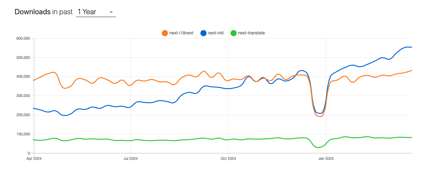 앱 라우터인지 페이지 라우터인지, i18n 라우팅하는지 아닌지에 따라 문서가 잘 나누어져 있고, 알려준대로 코드 복붙만 딱딱 해도 바로 작동했다. 또 번들 사이즈도 1.1kB에 주간 다운로드수도 약 55만에 꾸준히 성장하고 있어서 바로 채택했다. next-18next는 16.4kB, 42만 다운로드 수였다.