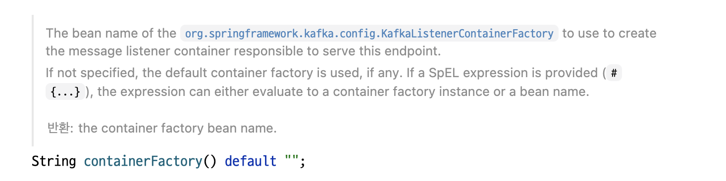 문제는, 스프링 카프카가 제공하는 @KafkaListener 어노테이션은 따로 속성으로 containerFactory 속성에 팩토리명을 지정하지 않으면 기본값으로 "kafkaListenerContainerFactory"를 조회한다.