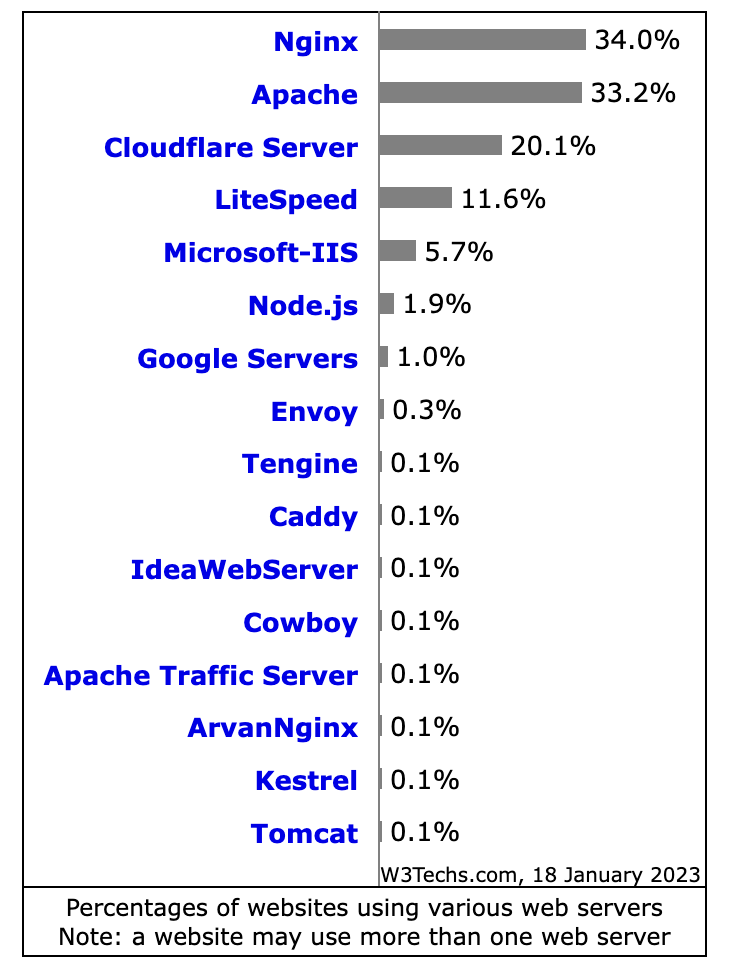 - Apache HTTP server : 다중 프로세스(쓰레드) 방식으로, 클라이언트가 요청할 때마다 프로세스나 쓰레드가 생성되어 커넥션을 형성하며 커넥션을 돌면서 처리를 하게 된다. 하지만 이는 컨텍스트 스위칭이 일어나 CPU와 메모리의 자원소모가 크며, 모바일 기기의 증가로 커넥션이 10,000개 이상일 때 뻗어버리는 현상(C10K)으로 Nginx에게 점유율 1위를 내어주게 되었다. 하지만 다양하고 검증된 기능이 필요하다면 아파치를 쓴다.
