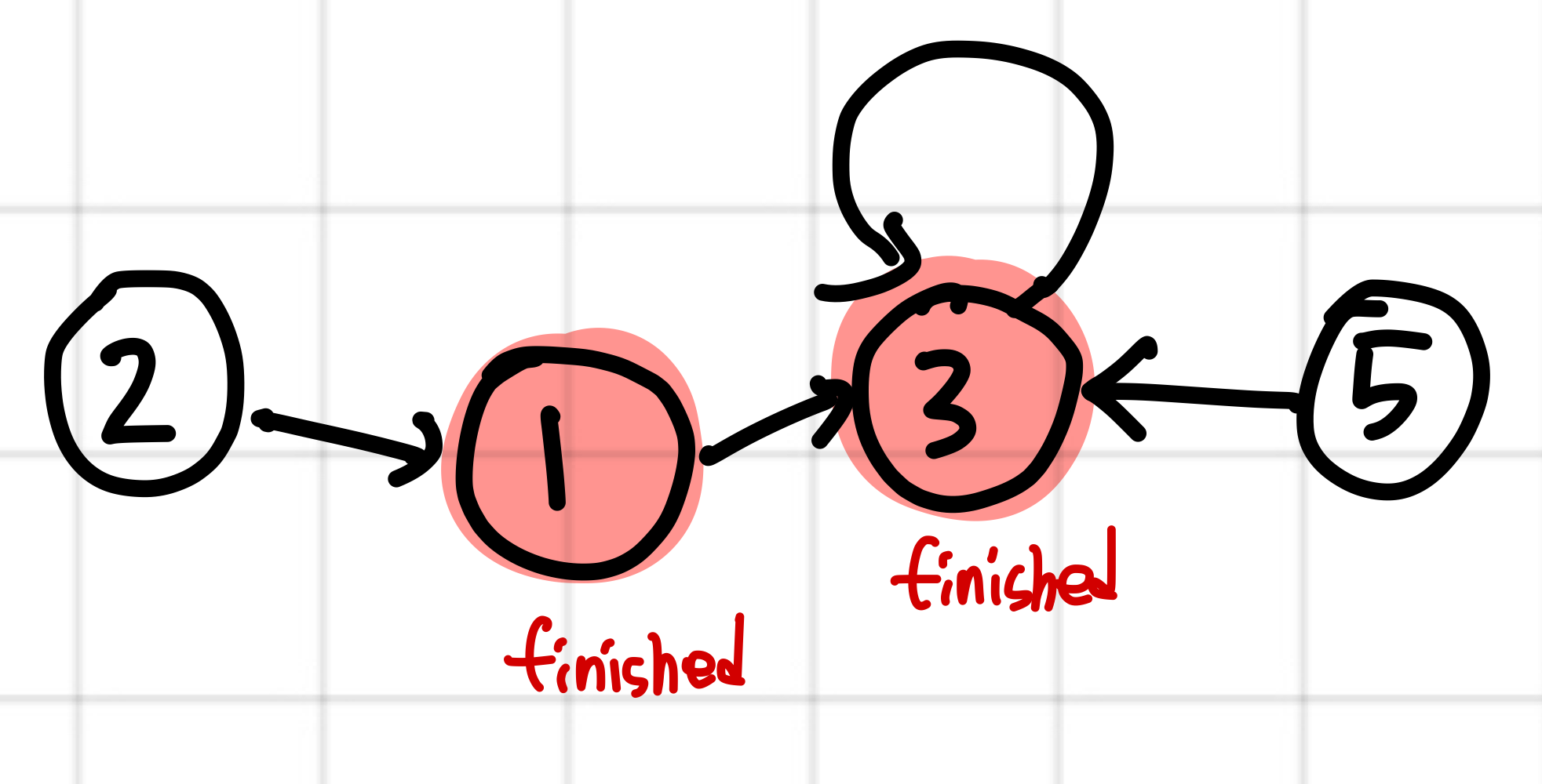 만약 1 -> 3 -> 3 으로 싸이클을 한번 계산해봤고, 이를 finished에 저장해뒀다면, 1 노드로 진입 시 이 이후는 싸이클을 형성한다는 것을 알고 있다. 그래서 2 -> 1 -> 3 -> 3 진행 시 2에서 1로 가는 시점에서 이 이후는 싸이클이 형성된다는 것을 finished 배열로 알 수 있고, 이후 더 진행하지 않는다. 마찬가지로 5 -> 3 -> 3 역시 5에서 3으로 진입 시 더 이상 진행하지 않는다.