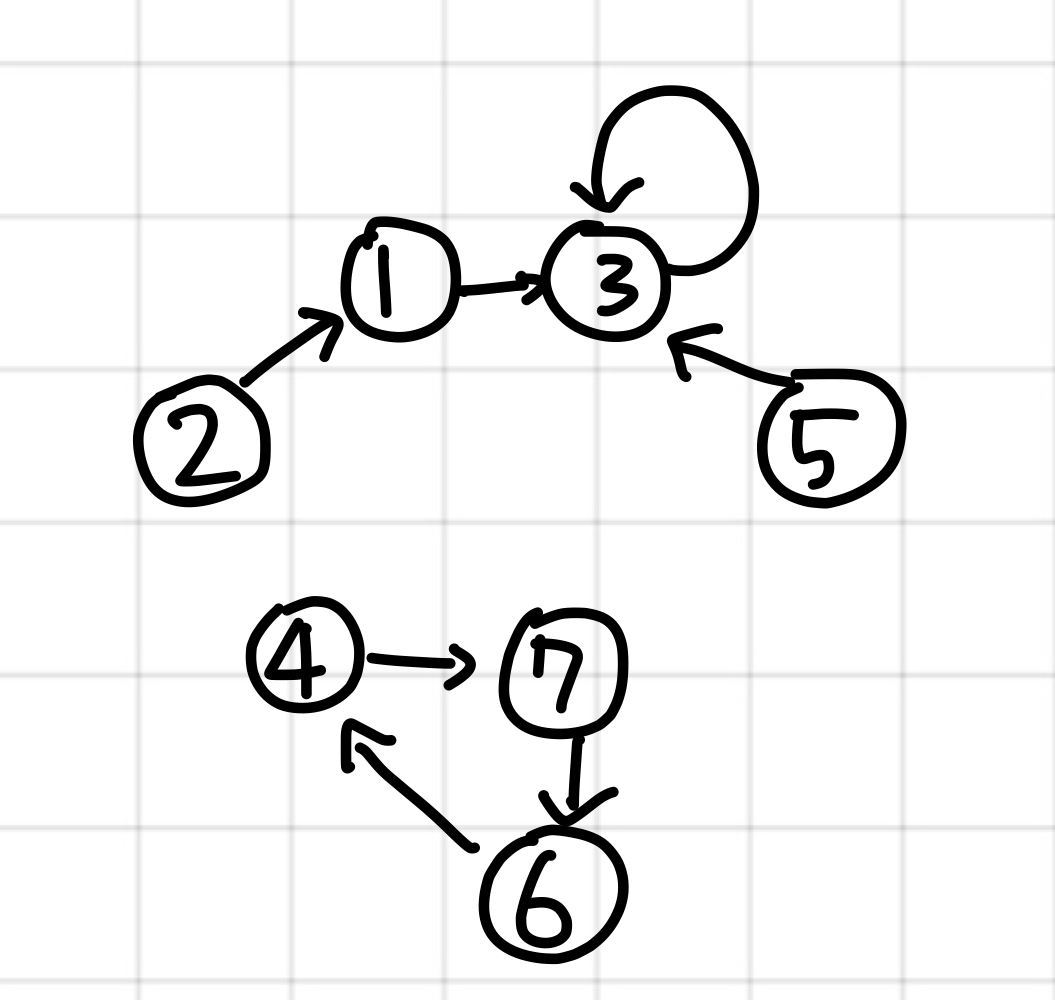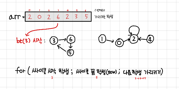 - 학생들이 서로 가리키다가 싸이클이 형성되면 하나의 팀이 된다. 이때 자기자신을 가리키면 혼자 한 팀이다.