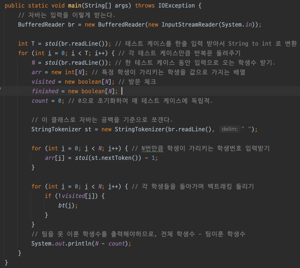 static boolean[] finished; // 방문한 학생들중 싸이클을 계산했었는지 체크하는 배열
