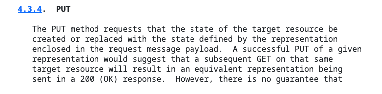 PUT은 자원을 대체(replace) 한다. 즉, 없으면 생성하고 있으면 기존 값을 버리고 요청값으로 바꾼다.